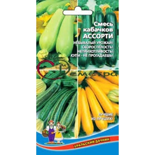 Великолепная смесь самых популярных сортов и гибридов, различных как по форме (овальные, цилиндрические,…), так и по цвету (жёлтые, белые, зелёные, полосатые...). Растения компактные, кустовые. Урожайность с растения 6-10 кг. Ценность смеси: неприхотливость выращивания, возможность получения разнообразного по вкусу урожая, скороспелость, урожайность и отличный вкус!